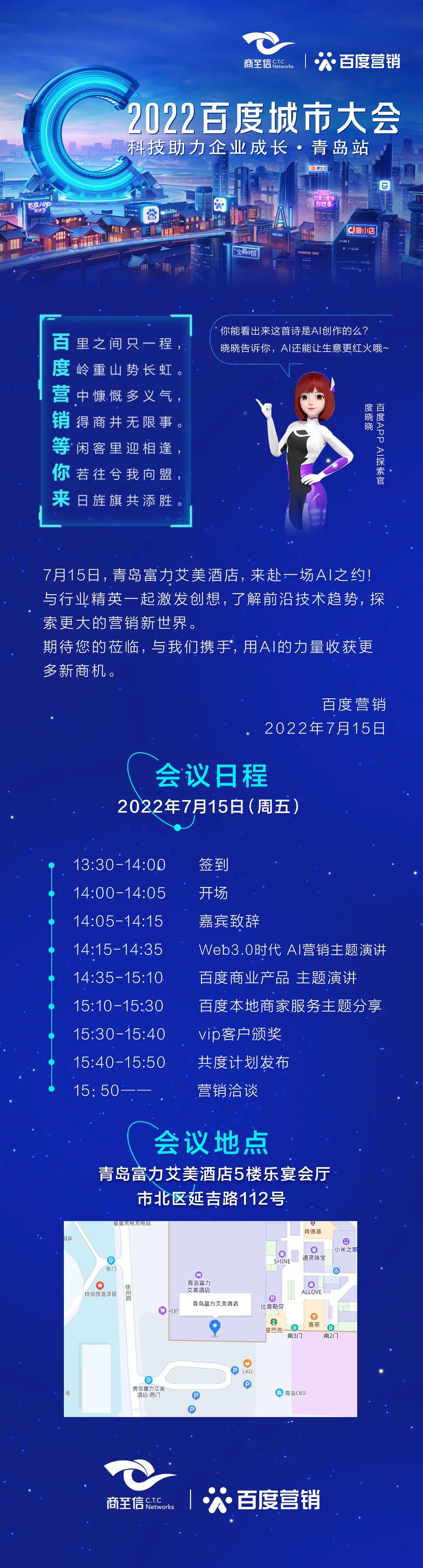 7月15日,百度攜手商至信集團開展的2022百度城市大會·青島站暨科技助力企業成長將于下午1:30在青島市延吉路112號富力艾美酒店召開。本次大會旨在通過互聯網手段助力青島地區企業崛起。